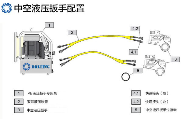 液壓扳手專用泵是液壓扳手的動(dòng)力單元.。液壓扳手專用泵屬于高壓泵,最高工作壓力一般為70MPa,常見(jiàn)的有電動(dòng)液壓泵和氣動(dòng)液壓泵。如下液壓扳手配置圖: